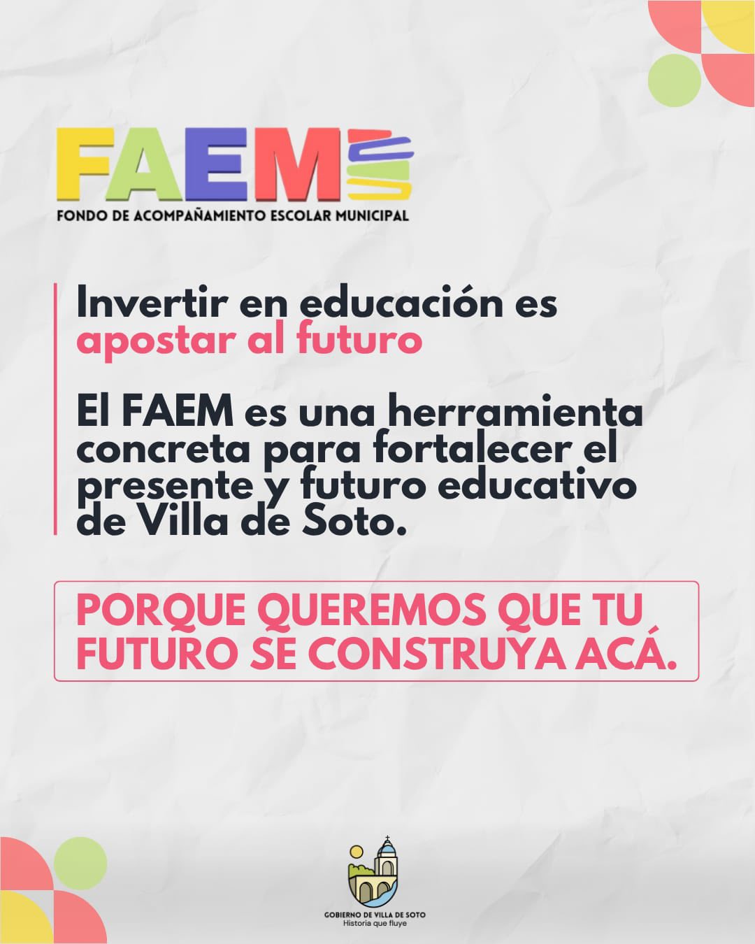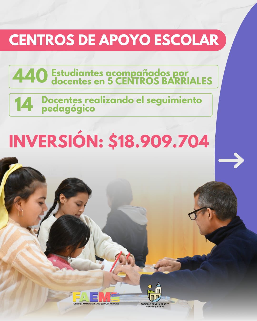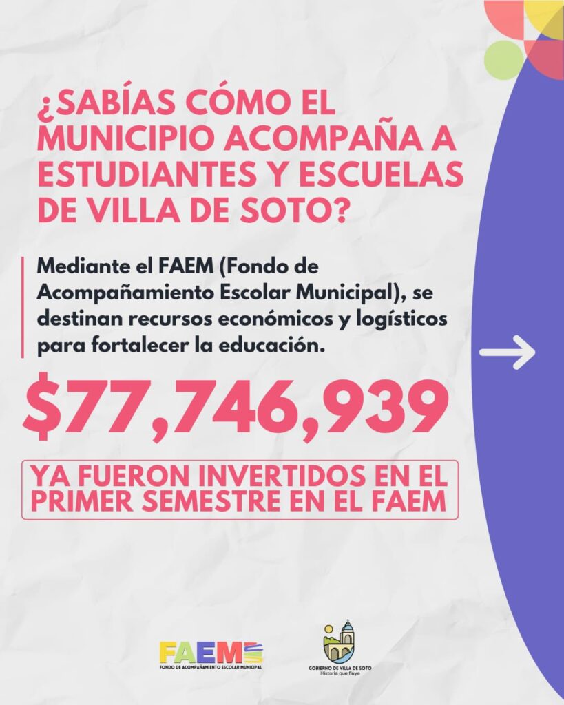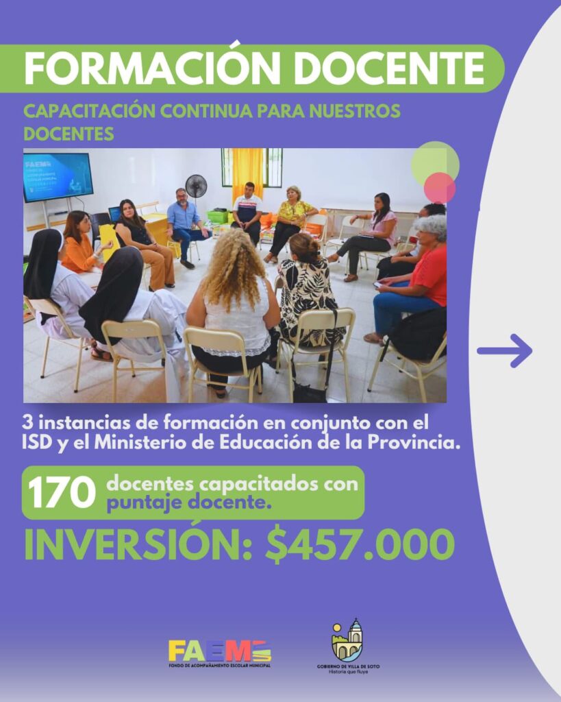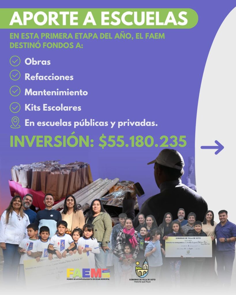 La Municipalidad de Villa de Soto informó que, en el primer semestre del año, se invirtieron $77.746,39 en el FAEM, un programa destinado a fortalecer la educación mediante recursos económicos y logísticos.